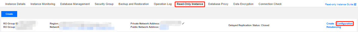 2. Pada halaman manajemen instans, pilih tab Read-Only Instance (Instans Baca Saja), cari grup RO yang diinginkan, dan klik Configuration (Konfigurasi) untuk masuk ke halaman konfigurasi grup RO.