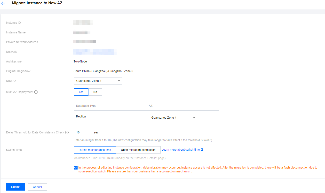 1. Login ke konsol TencentDB for MySQL. Dalam daftar instans, klik instance ID (ID instans) atau Manage (Kelola) di kolom Operation (Operasi) untuk masuk ke halaman detail instans. 2. Pada halaman Instance Details (Detail Instans), pilih Basic Info (Info Dasar) > Region/AZ (Wilayah/AZ) dan klik Migrate to New AZ (Migrasikan ke AZ Baru), atau pilih Availability Info (Info Ketersediaan) > Deployment Mode (Mode Deployment) dan klik Modify Replica AZ (Modifikasi AZ Replika).