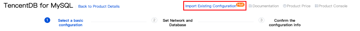 Halaman pembelian versi baru mendukung Impor konfigurasi yang sudah ada dengan sekali klik. Ketika akun yang login memiliki instance TencentDB for MySQL yang sudah dibuat, konfigurasi yang sama dengan instance yang sudah ada dapat dipilih dengan cepat menggunakan fungsi ini, sehingga memudahkan Anda dalam melakukan penyesuaian cepat atau pembelian langsung berdasarkan konfigurasi yang ada. Panduan operasinya adalah sebagai berikut.