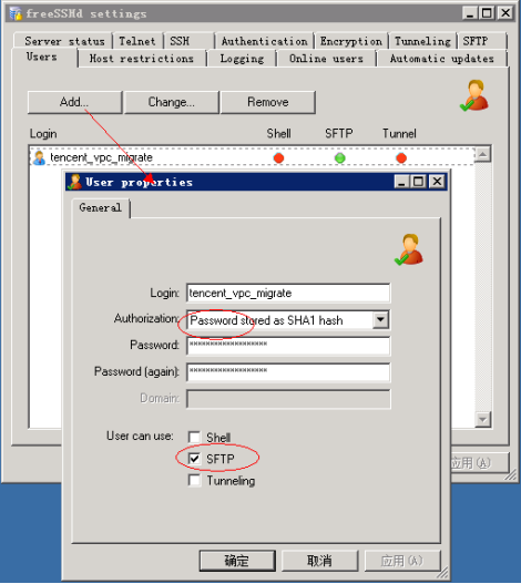 6. Pilih tab Users (Pengguna) dan masukkan pengguna tencent_vpc_migrate (nama pengguna ini tidak dapat diubah) dan kata sandi tencent_vpc_migrate (kata sandi ini tidak dapat diubah) seperti yang ditunjukkan di bawah ini: