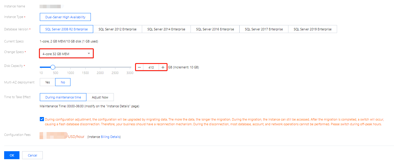 | Peningkatan spesifikasi + pengurangan kapasitas disk | Migrasi, peningkatan, dan penurunan | 1. Migrasi data akan terlibat selama penyesuaian konfigurasi instans, dan semakin tinggi volume data, semakin lama waktu migrasi data. Akses ke instans tidak akan terpengaruh selama periode ini. 2. Peralihan akan dilakukan setelah migrasi selesai, yang disertai dengan pemutusan dari database yang berlangsung hanya beberapa detik. Pastikan bisnis Anda memiliki mekanisme koneksi ulang. 3. Selama pemutusan sementara, sebagian besar operasi yang terkait dengan database, akun, dan jaringan tidak dapat dijalankan. Dengan demikian, pastikan untuk melakukan peralihan selama jam normal. | Anda harus memilih waktu untuk memberlakukannya. |