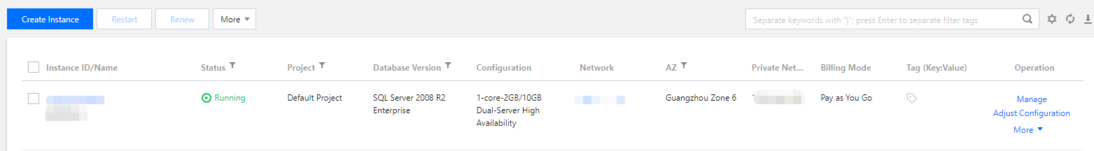 Mulai ulang | Dalam daftar instans, Anda dapat memilih sebuah instans dan klik Restart (Mulai Ulang) di bagian atas untuk memulai ulang. Anda juga dapat memilih beberapa instans untuk memulai ulang batch. Selama memulai ulang, instans tidak akan dapat diakses, dan koneksi yang ada akan ditutup. Selama mulai ulang, jika jumlah penulisan bisnis tinggi, mulai ulang akan gagal. Dalam hal ini, instans akan kembali ke status sebelum memulai ulang dan dapat diakses. Mulai ulang instans selama jam tidak sibuk untuk memastikan tingkat keberhasilan memulai ulang dan mengurangi dampaknya pada bisnis Anda. |