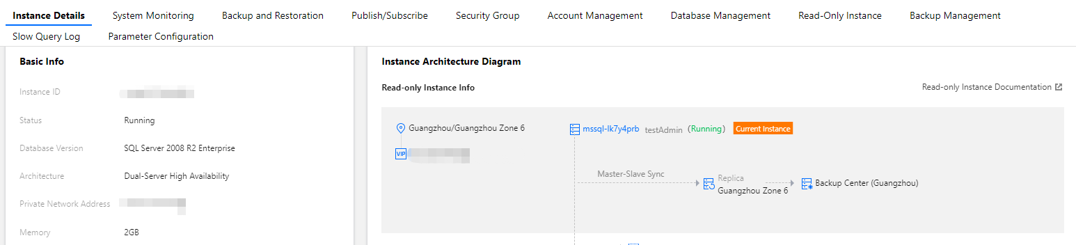 Instans Baca Saja | Pada tab Read-Only Instance (Instans Baca Saja), Anda dapat membuat satu atau beberapa instans baca saja, yang dapat diterapkan pada skenario aplikasi pemisahan baca/tulis dan satu-sumber-beberapa-replika untuk meningkatkan kapasitas beban baca database Anda. Untuk informasi selengkapnya, lihat Membuat Instans Baca Saja. |
