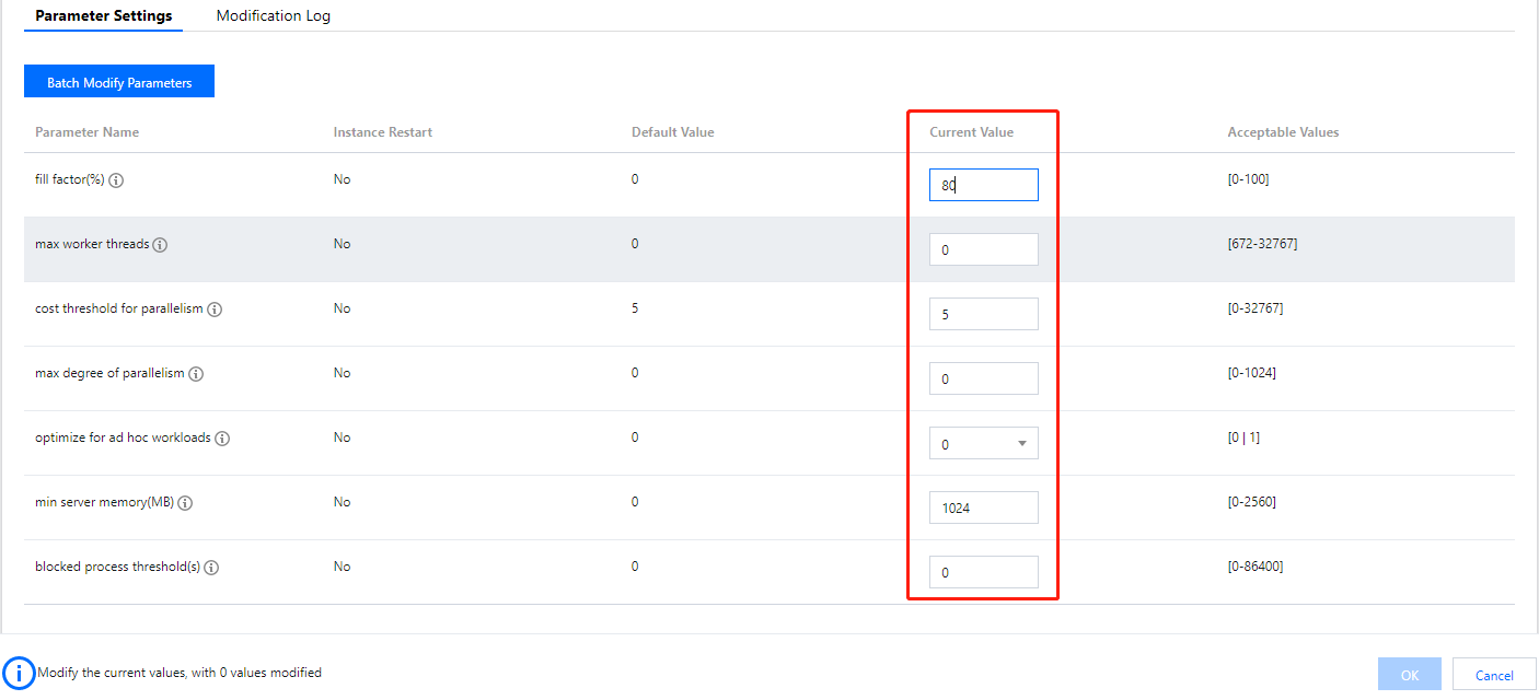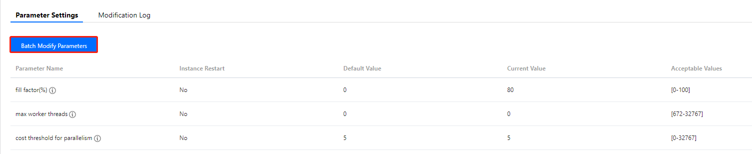 1. Login ke konsol TencentDB for SQL Server. Dalam daftar instans, klik ID instans atau Manage (Kelola) di kolom Operation (Operasi) untuk mengakses halaman manajemen instans. 2. Pada halaman manajemen instans, pilih tab Parameter Configuration (Konfigurasi Parameter) > Parameter Settings (Pengaturan Parameter) dan klik Batch Modify Parameters (Modifikasi Parameter Secara Massal).