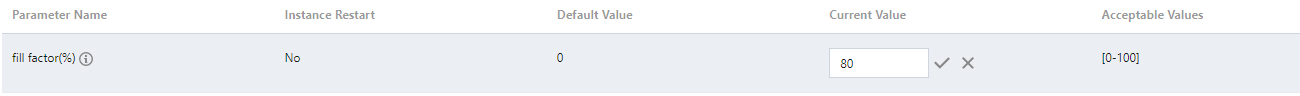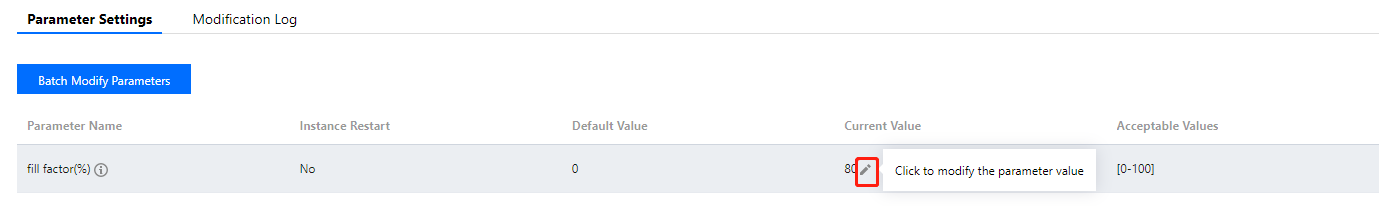 2. Pada halaman manajemen instans, pilih tab Parameter Configuration (Konfigurasi Parameter) > Parameter Settings (Pengaturan Parameter), pilih baris parameter target, dan klik di kolom Current Value (Nilai Saat Ini) untuk memodifikasi nilainya.