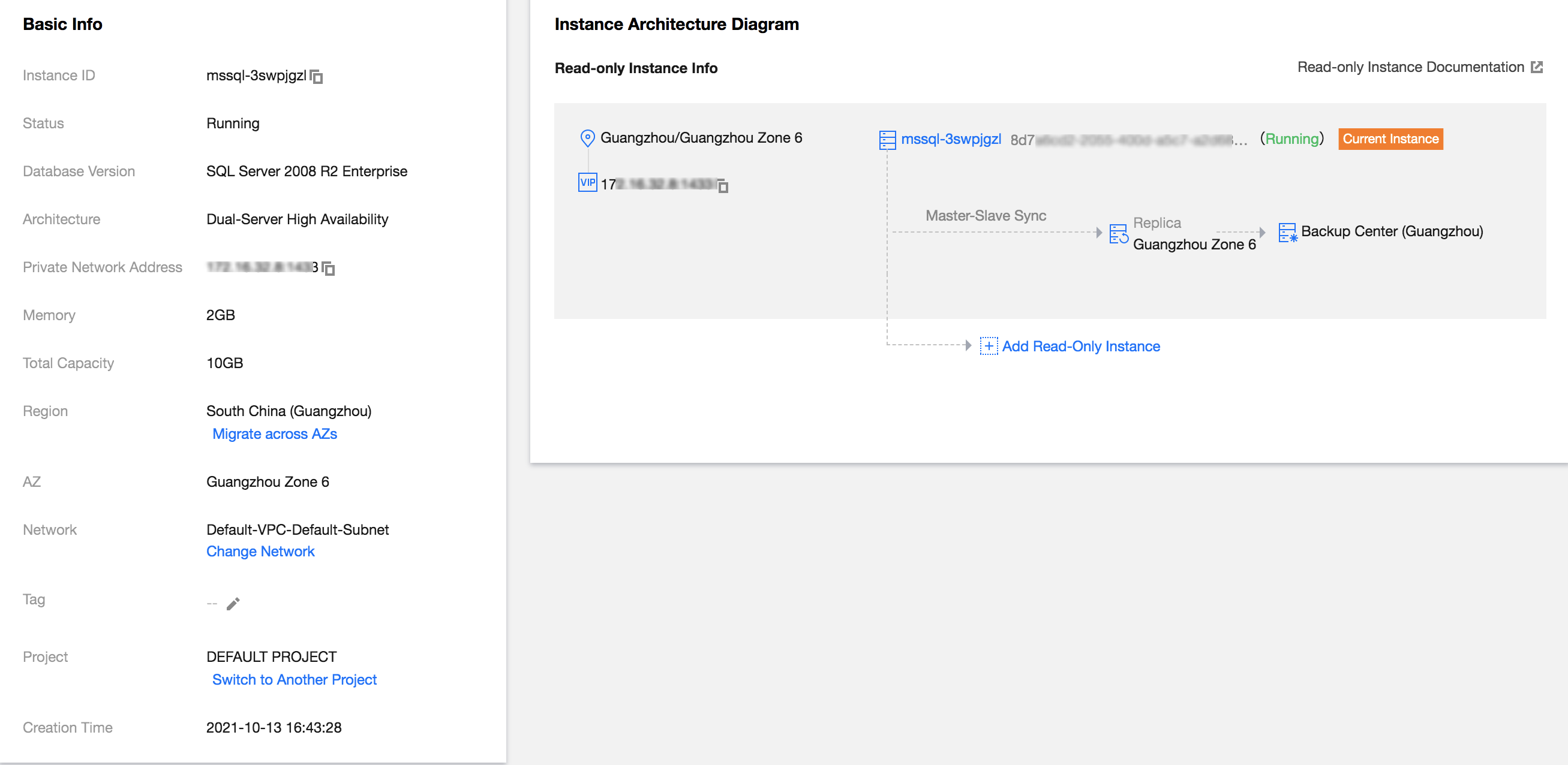 1. Login ke konsol TencentDB for SQL Server. Dalam daftar instans, klik ID instans atau Manage (Kelola) di kolom Operation (Operasi) untuk mengakses halaman detail instans. 2. Di bagian Basic Info (Info Dasar), klik Migrate across AZs (Migrasi di seluruh AZ) untuk mengakses halaman migrasi lintas AZ.