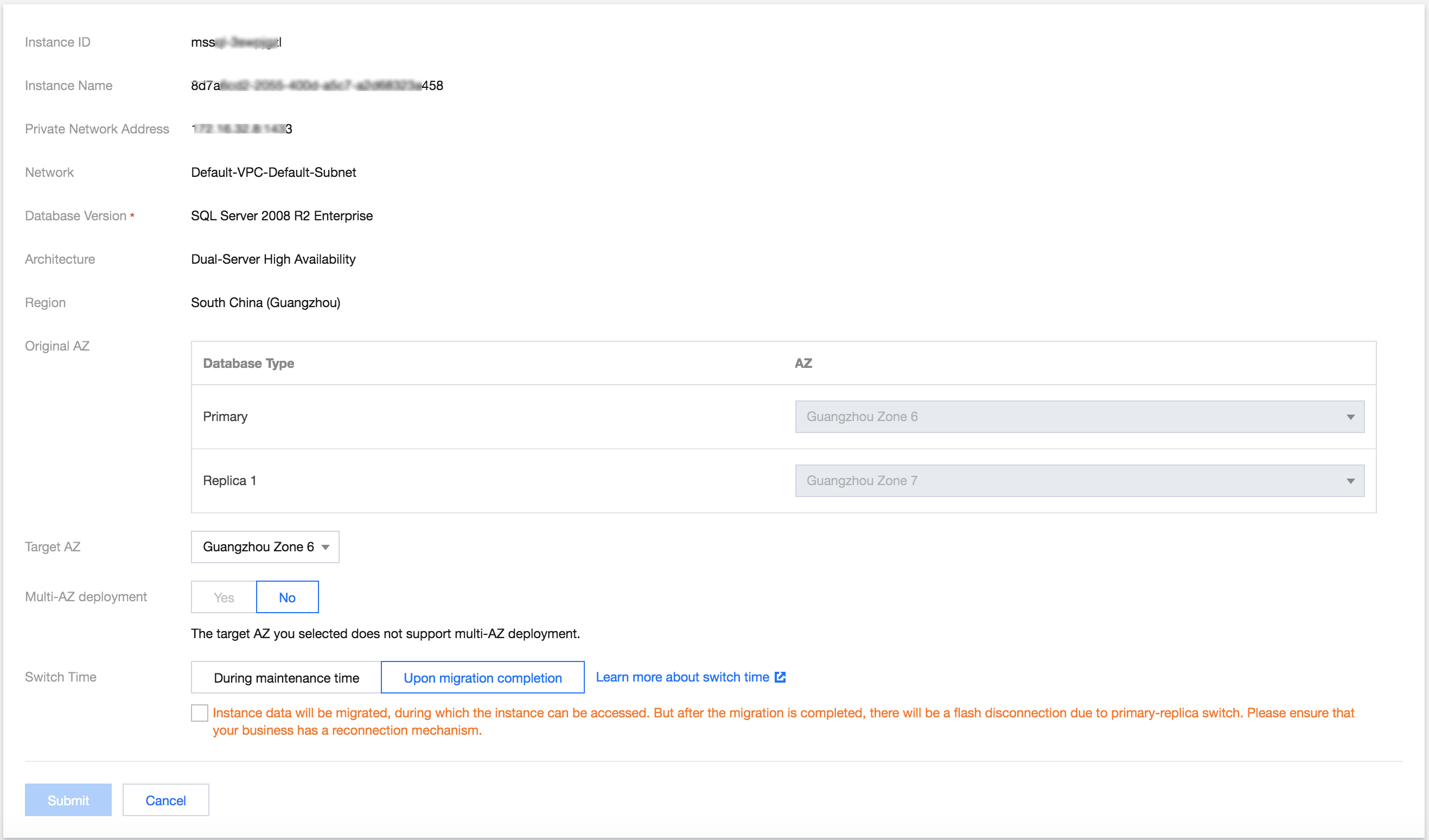 3. Lihat AZ instans asli, tentukan AZ target, aktifkan/nonaktifkan deployment multi-AZ, pilih waktu peralihan, centang kotak untuk menyetujui aturan migrasi lintas AZ, dan klik Submit (Kirim).