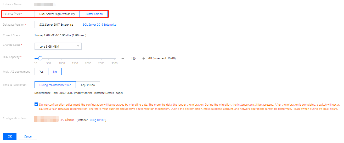Migrasi data akan terlibat selama penyesuaian konfigurasi instans, dan semakin tinggi volume data, semakin lama waktu migrasi data. Akses ke instans tidak akan terpengaruh selama periode ini.