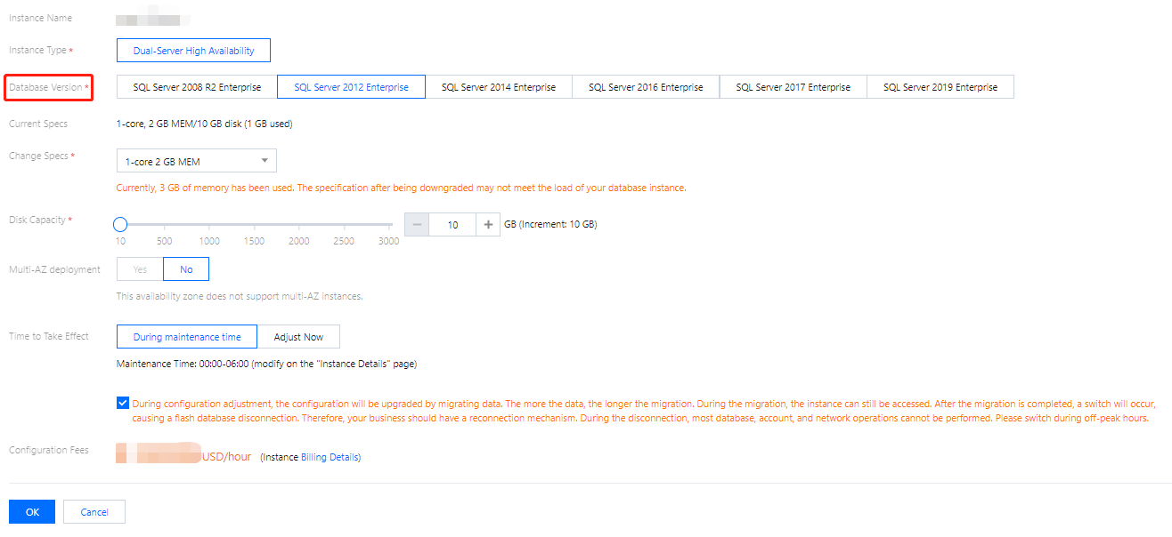 Migrasi data akan terlibat selama penyesuaian konfigurasi instans, dan semakin tinggi volume data, semakin lama waktu migrasi data. Akses ke instans tidak akan terpengaruh selama periode ini.