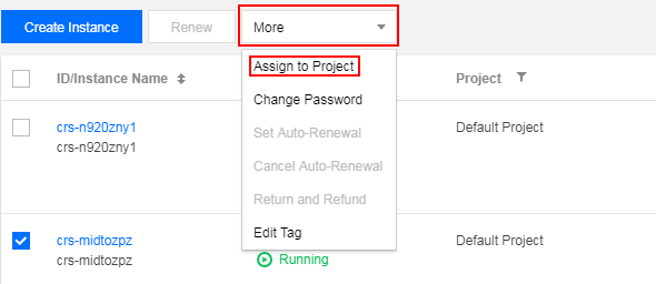 1. Login ke Konsol Redis. Pilih instans target dalam daftar instans dan klik More (Lainnya) > Assign to Project (Tetapkan ke Proyek) di bagian atas.