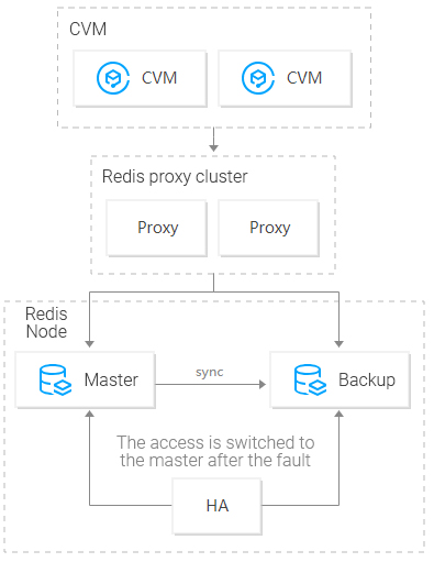 Dengan arsitektur master/replika server ganda, node master dan replika berada pada mesin fisik yang berbeda dengan node master menyediakan akses eksternal. Anda dapat melakukan CRUD data menggunakan baris perintah atau klien Redis. Jika node master gagal, sistem ketersediaan tinggi (HA) yang dipatenkan akan secara otomatis menjalankan peralihan master/replika untuk memastikan kelancaran operasi bisnis.