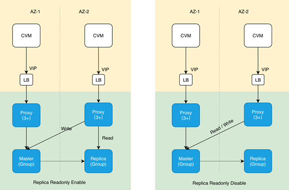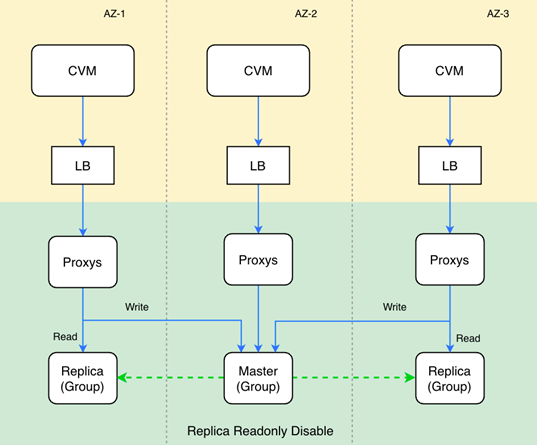 Pemisahan Baca/Tulis dinonaktifkan (yaitu, replika dapat ditulis dan dibaca dari): Permintaan tulis/baca di AZ replika dirutekan oleh proksi ke node master, dan node master disinkronkan dengan node replika untuk memastikan data yang konsisten di semua node. Dalam proses ini, hanya satu akses lintas-AZ yang terjadi.