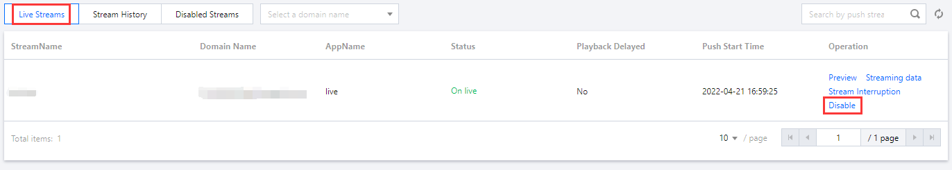 Klik Disable (Nonaktifkan) untuk menonaktifkan streaming. Setelah streaming dinonaktifkan, Anda tidak dapat lagi melakukan push pada streaming tersebut.