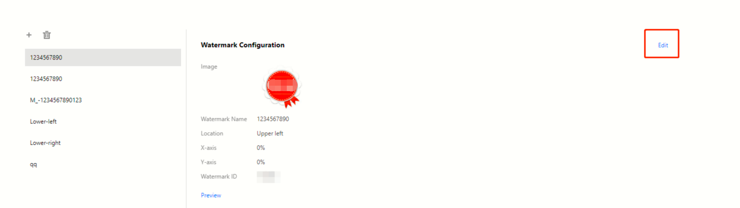1. Buka Feature Configuration > Live Watermarking (Konfigurasi Fitur > Pemberian Watermark Langsung). 2. Pilih templat watermark target, lalu klik Edit di sebelah kanan untuk mengubah informasi templat.