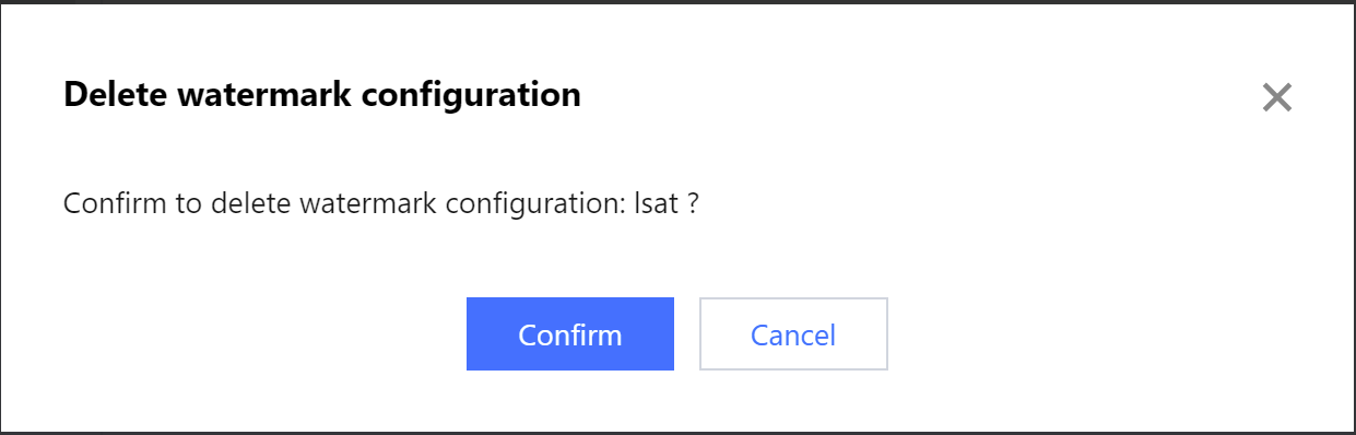 Jika templat telah terikat ke nama domain tertentu, Anda harus melepaskan ikatan templat sebelum menghapusnya. Petunjuk mendetail dapat dilihat di Melepaskan Ikatan. 1. Buka Feature Configuration > Live Watermarking (Konfigurasi Fitur > Pemberian Watermark Langsung). 2. Temukan templat watermark target yang telah Anda buat, lalu klik ikon penghapusan di bagian atas. 3. Di kotak dialog pop-up, klik Confirm (Konfirmasi) untuk mengonfirmasi penghapusan.