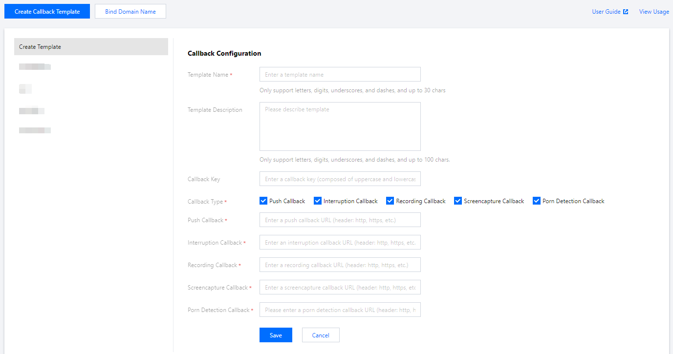 2. Pilih Event Center > Live Stream Callback (Pusat Peristiwa > Panggilan Balik Streaming Langsung) di bilah sisi kiri. 3. Klik Create Callback Template (Buat Templat Panggilan Balik), isi informasi, pilih jenis panggilan balik yang ingin Anda terima, masukkan URL panggilan balik, dan klik Save (Simpan).