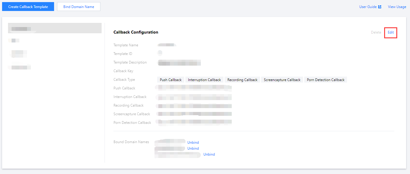Di konsol, Anda dapat mengelola templat panggilan balik berdasarkan nama domain, tetapi tidak dapat membatalkan aturan yang dibuat oleh API. Jika Anda mengikat templat dengan streaming tertentu melalui API panggilan balik dan ingin melepaskan ikatan tersebut, Anda perlu memanggil API DeleteLiveCallbackRule. Informasi selengkapnya tentang parameter pemberitahuan panggilan balik streaming langsung dapat dilihat di referensi berikut: