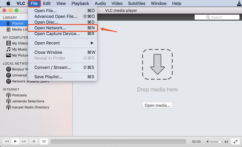 2. Buka VLC, lalu pilih File > Open Network (File > Jaringan Terbuka).