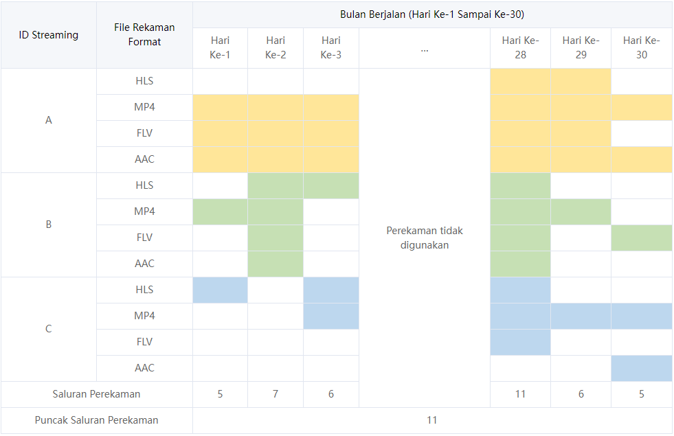 Perekaman langsung dikenai tagihan berdasarkan jumlah puncak saluran perekaman bersamaan pada bulan berjalan, dan jumlah total saluran perekaman dalam suatu periode statistik merupakan puncak saluran bersamaan. Satu streaming langsung yang direkam dalam satu format file dihitung sebagai satu saluran perekaman. Jika Anda merekam dalam dua format (MP4 dan HLS), keduanya akan dihitung sebagai dua saluran perekaman.
