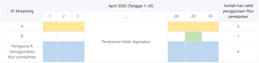 Sebuah templat perekaman dikonfigurasi oleh pengguna A untuk nama domain A dan B di konsol CSS dengan 1 format file rekaman untuk nama domain A dan 2 format untuk nama domain B. Nama domain A memiliki 11 push langsung pada 2 April 2020 dan memiliki 10 push pada 5 hari lainnya. Nama domain B memiliki 1 push langsung pada 29 April 2020. Tabel berikut memperlihatkan jumlah hari penggunaan fitur perekaman oleh nama domain A dan B: