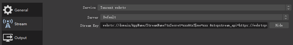 3. Klik Stream (Streaming), pilih Tencent webrtc untuk Service (Layanan) dan Default untuk Server, masukkan URL push WebRTC yang telah dibuat ke bidang Stream Key (Kunci Streaming), lalu tambahkan &stopstream_api=https://webrtcpush.myqcloud.com/webrtc/v1/stopstream di belakangnya. **Contoh kunci streaming:**