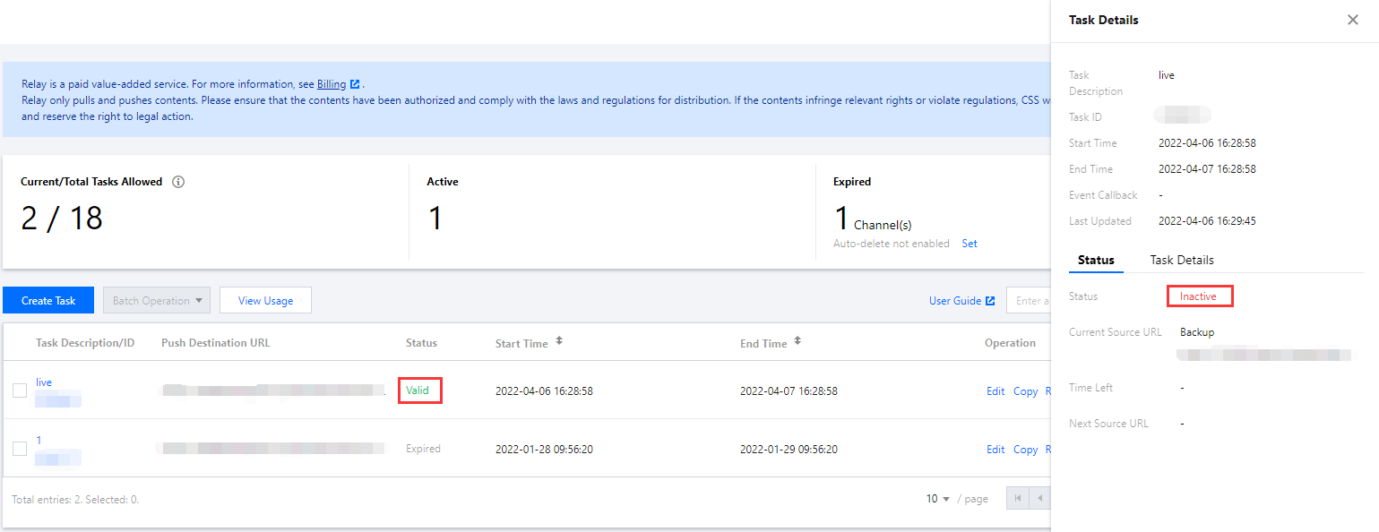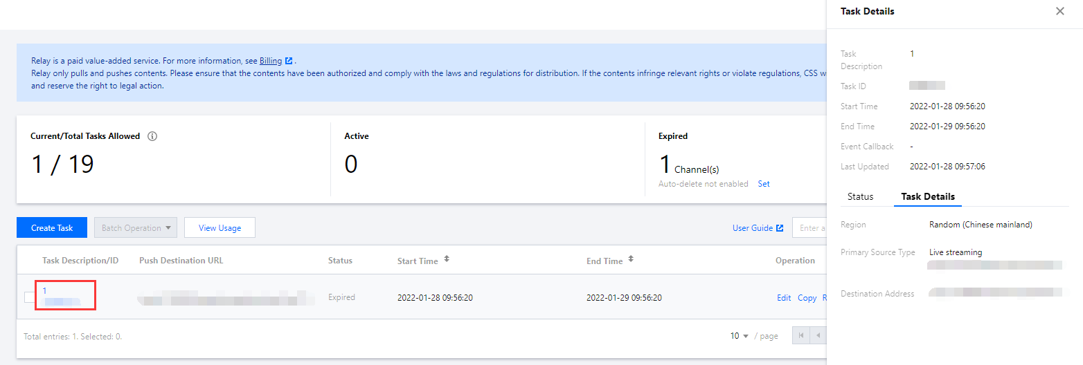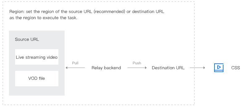 Biaya fitur relai dikenakan berdasarkan durasi tugas relai. Informasi lebih lanjut dapat dilihat di Relay (Relai). Relai hanya melakukan pull dan push pada konten. Pastikan bahwa konten telah diberi izin dan mematuhi undang-undang dan peraturan untuk distribusi. Jika konten melanggar hak terkait atau melanggar peraturan, CSS akan menangguhkan fitur terkait dan berhak mengambil tindakan hukum.