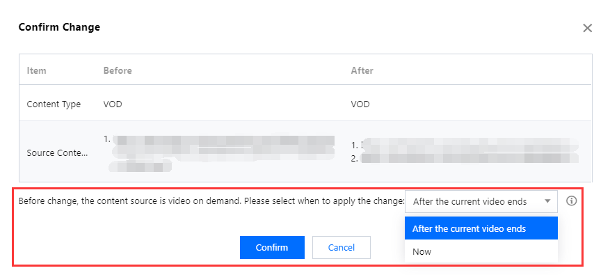 Jika URL sumber untuk Custom video path (Jalur video kustom) diubah, Anda harus memilih untuk menerapkan perubahan After the current video ends (Setelah video saat ini berakhir) (default) atau Now (Sekarang). Setelah perubahan diterapkan, relai akan dimulai ulang dari URL sumber pertama.