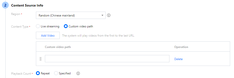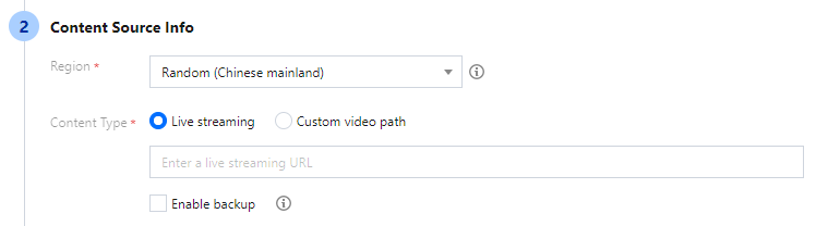 4. Untuk Content Type (Jenis Konten), Anda dapat memilih Live streaming (Streaming langsung) atau Custom video path (Jalur video kustom).