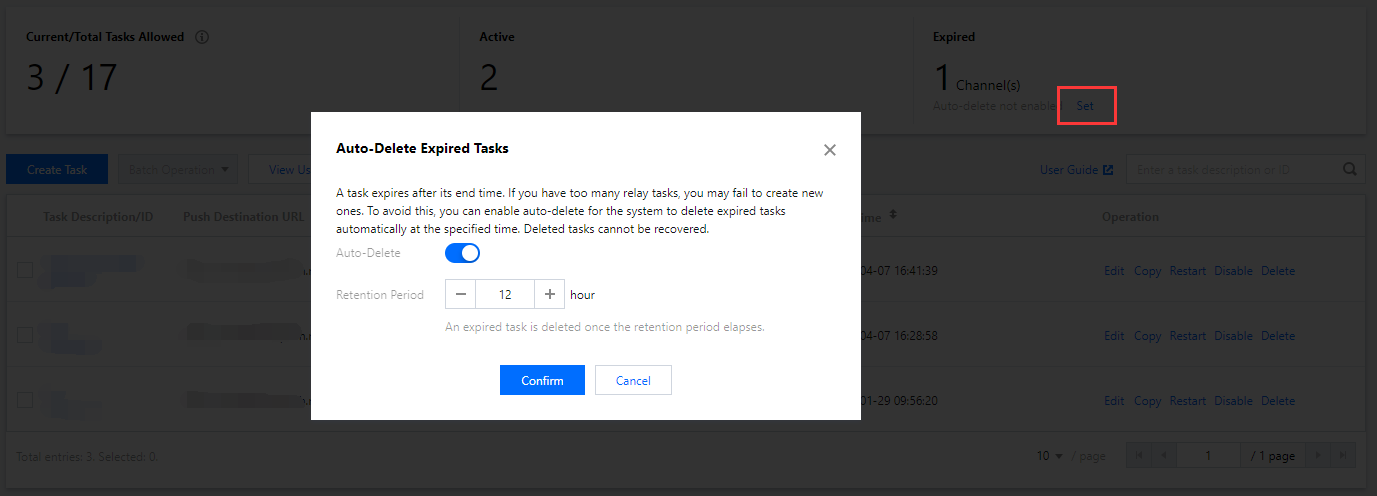 Tugas kedaluwarsa setelah waktu berakhir tugas. Jika memiliki terlalu banyak tugas relai, Anda mungkin tidak dapat membuat tugas relai baru. Untuk menghindarinya, Anda dapat mengaktifkan penghapusan otomatis agar sistem menghapus tugas kedaluwarsa secara otomatis pada waktu yang ditentukan. Tugas yang dihapus tidak dapat dipulihkan.