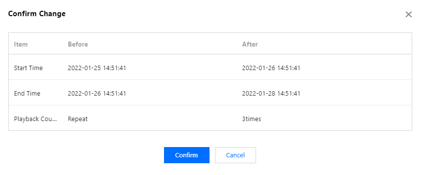 Misalnya, Anda memodifikasi start time, end time, and playback count (waktu mulai, waktu berakhir, dan jumlah pemutaran ulang) tugas. Anda akan melihat informasi berikut di jendela pop-up: