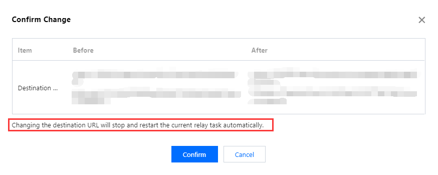 Jika Destination Address (Alamat Tujuan) diubah, sistem akan mengingatkan Anda bahwa setelah Anda mengeklik Confirm (Konfirmasi), tugas relai saat ini akan berhenti dan dimulai ulang.