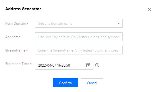 5.2 Pilih nama domain push yang sudah ada, masukkan Appname, StreamName, dan waktu kedaluwarsa, lalu klik Confirm (Konfirmasi) untuk membuat URL push, yang akan diisi secara otomatis sebagai Destination Address (Alamat Tujuan).