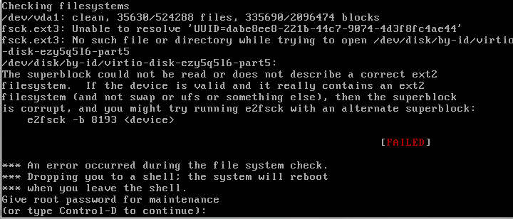 Anda harus terlebih dahulu masuk ke instance, dan melakukan operasi umount pada disk cloud elastis yang ingin Anda lepas.Jika Anda secara langsung memaksa melepas tanpa menjalankan operasi umount, masalah yang ditunjukkan pada gambar berikut dapat terjadi selama pematian dan bootup: Jika Anda membuat volume logis LVM pada CVM, melepas disk langsung dari konsol akan menyebabkan sebagian data perangkat tetap berada di memori CVM.Jika aplikasi CVM mencoba melintasi atau mengakses perangkat ini, kesalahan sistem akan terjadi.Akibatnya, Anda harus terlebih dahulu menjalankan operasi berikut (contoh ini mengasumsikan bahwa volume logis /dev/test/lv1 dibuat berdasarkan /dev/vdb1, dan dipasang di bawah direktori /data):
