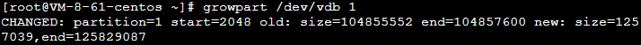 Gunakan memperluas partisi /dev/vdb1 sebagai contoh.Perhatikan bahwa ada spasi antara /dev/vdb dan 1 dalam perintah.Ganti dengan nilai aktual Anda.