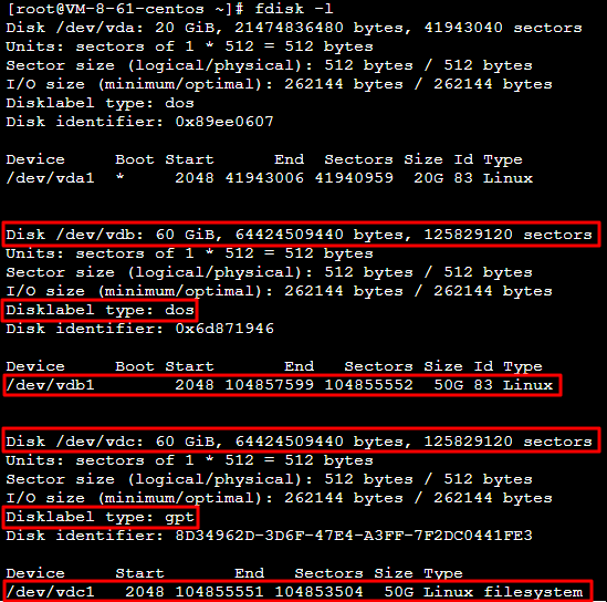 Seperti yang ditunjukkan pada gambar, Disk data /dev/vdb 60 GB berisi partisi MBR 50 GB /dev/vdb1.
