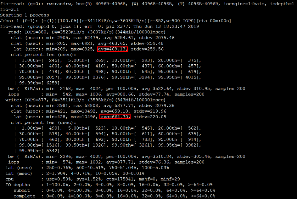 fio --bs=4k --ioengine=libaio --iodepth=1 --direct=1 --rw=randrw --time_based --runtime=100 --refill_buffers --norandommap --randrepeat=0 --group_reporting --name=fio-read --size=1G --filename=/dev/vdb