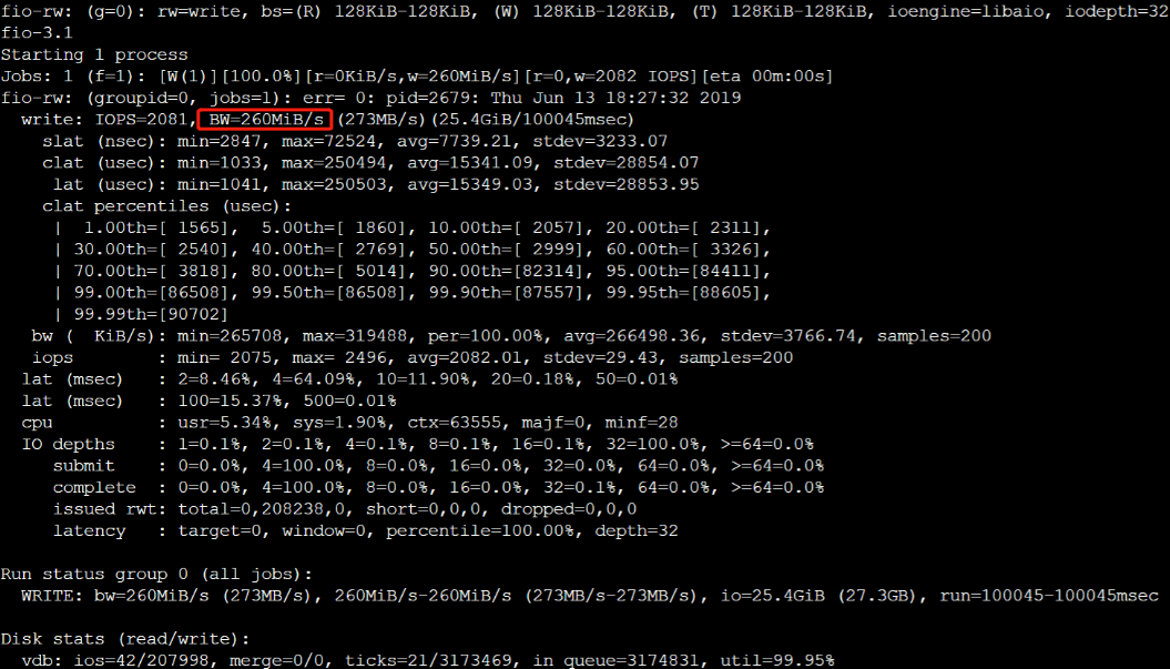 fio -bs=128k -ioengine=libaio -iodepth=32 -direct=1 -rw=write -time_based -runtime=600 -refill_buffers -norandommap -randrepeat=0 -group_reporting -name=fio-write-throughput --size=10G -filename=/dev/vdb