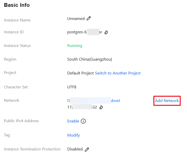 1. Log in to the TencentDB for PostgreSQL console. In the instance list, click an Instance ID or Manage in the Operation column to enter the instance management page. 2. On the instance details page, click Add Network in Basic Info > Network.