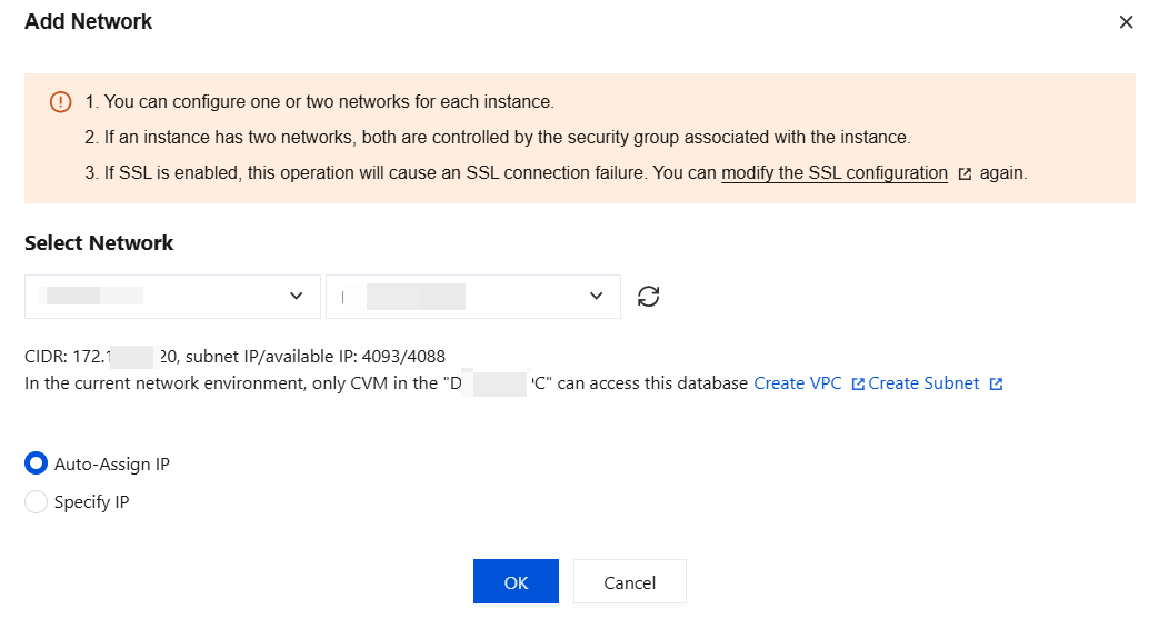 Custom primary instance IP: you can specify the IP address when adding a network on the instance details page of the primary instance.