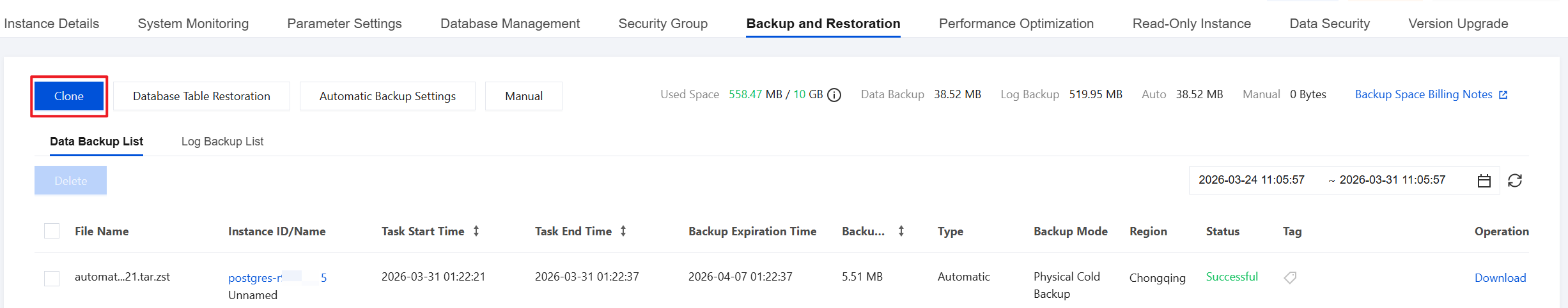 1. Log in to the PostgreSQL Console. In the instance list, click Instance ID or Manage in the Operation column to go to the instance management page. 2. On the instance management page, choose Backup and Restoration > Data Backup List page, and click Clone in the upper-left corner.