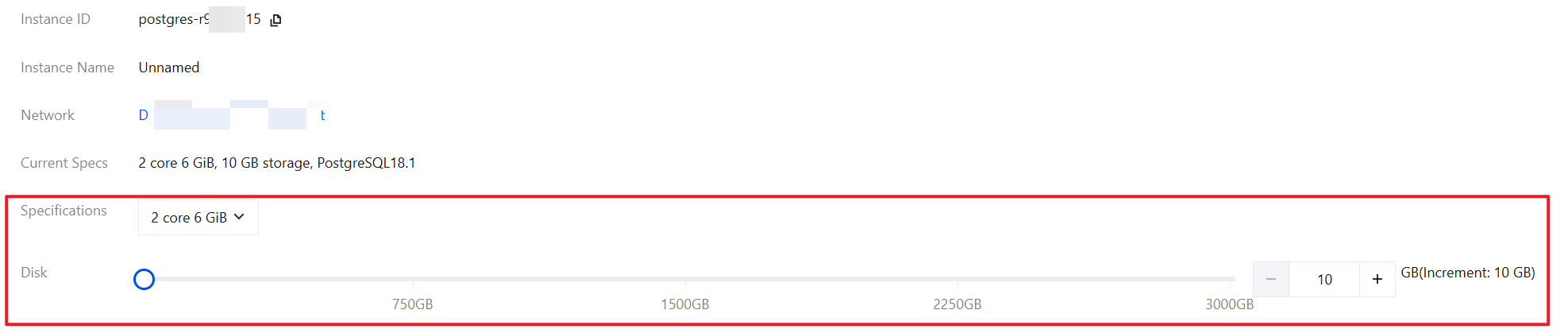 To leave sufficient space for restoring compressed backup files, the system defaults to the new instance storage specifications being at least four times the size of the compressed files. After cloning is complete, scale-in can be performed to avoid space waste. You can log in to the console, go to the instance details, click Adjust Configuration in the configuration information, and modify the instance specifications and disk capacity.