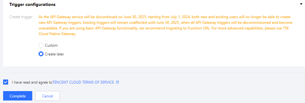 6. Check the service agreement box. After completing the above configurations, check the agreement box. Click Complete, and the SCF has been successfully created.