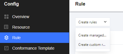 1. In the Config console, navigate to the Rules page. Choose New Rule > New Custom Rule to go to the rule configuration page. 2. On the Basic Attributes page in the custom rule configuration, configure the basic information, select the newly deployed cloud function (SCF), and click Next.