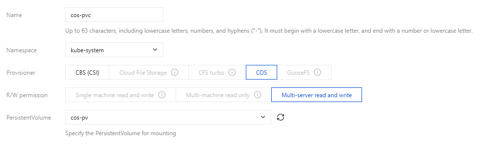 PersistentVolume: Select the PV that you created in Step 2. This document uses cos-pv as an example. 3. Click Create PersistentVolumeClaim.