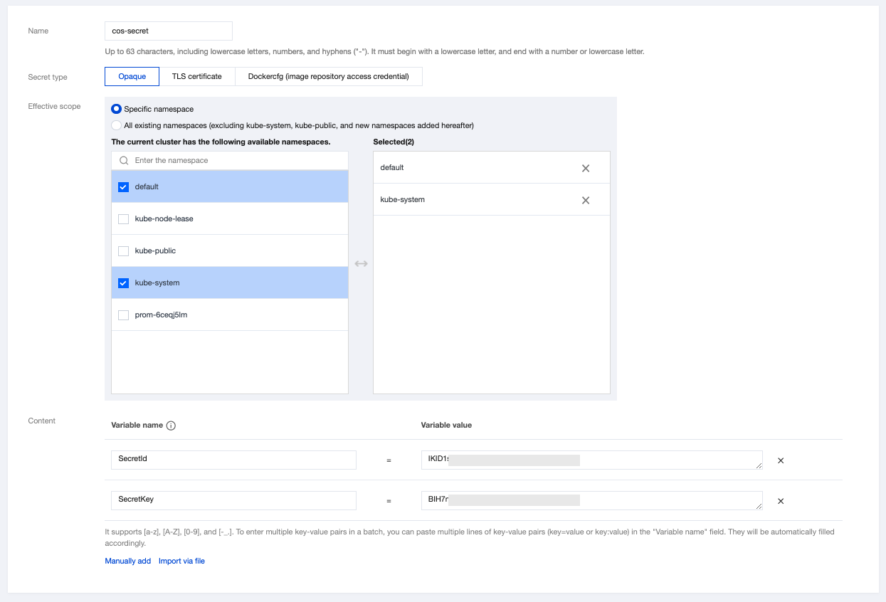 Secret: Select the Secret created in Step 1. This document uses cos-secret as an example. Make sure that the Secret is created under the kube-system namespace. Buckets list: The list of buckets used to save COS objects. You can select an available bucket as required.