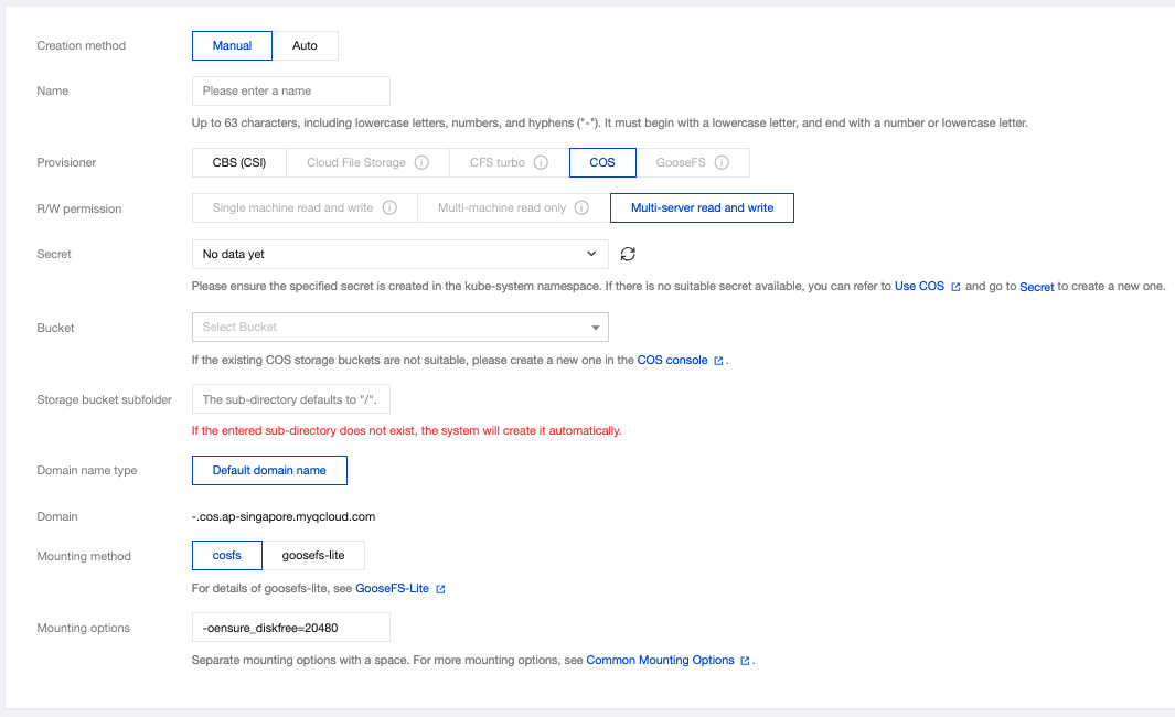 Name: Enter a custom name. This document uses cos-pv as an example.