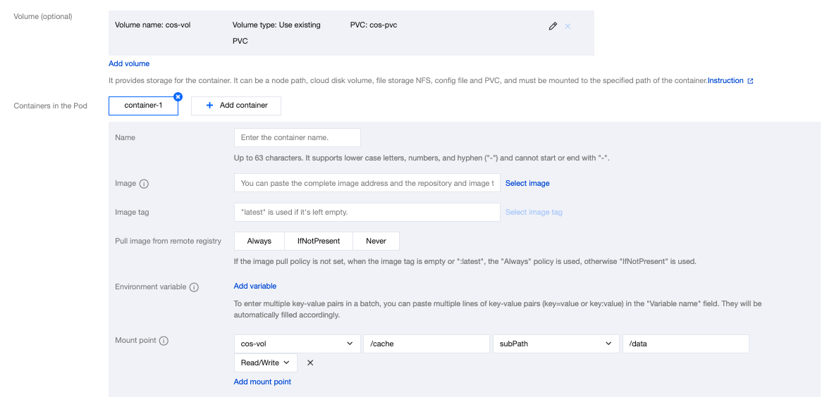 Select PVC: Select the PVC that you created in Step 3. This document uses cos-pvc as an example. Containers in the Pod: Click Add mount point to set a mount point.