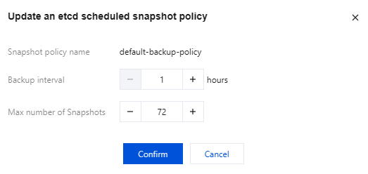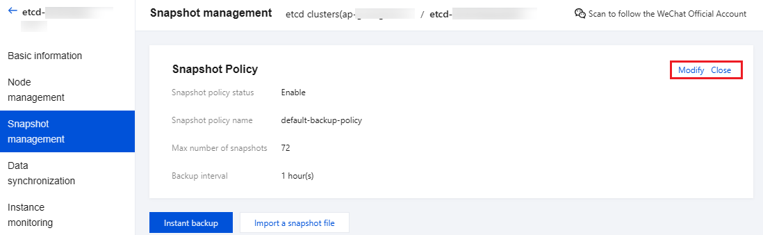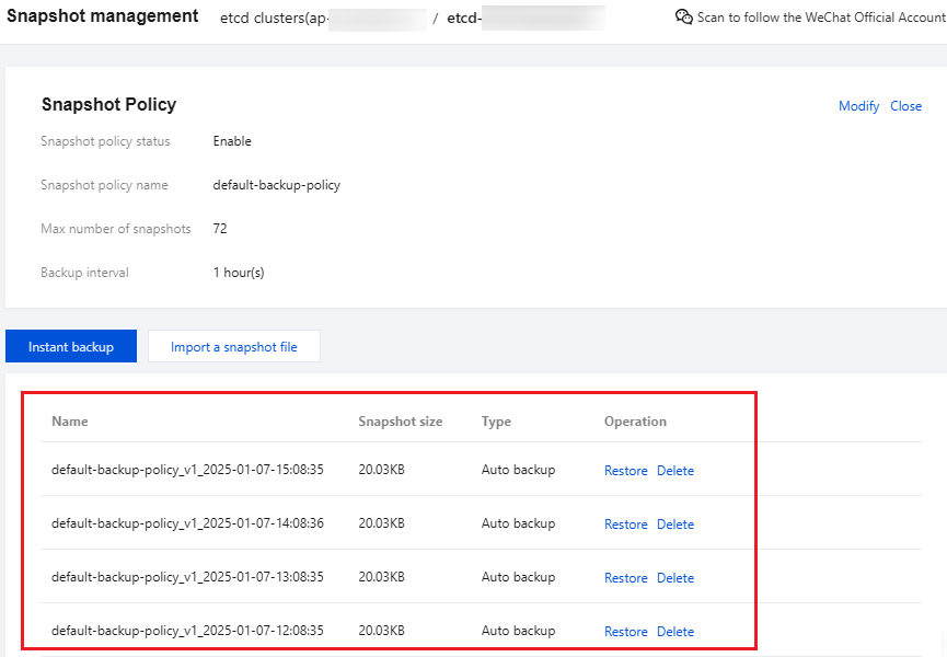The data backup feature is enabled for etcd clusters by default during cluster creation. The system will generate a scheduled snapshot policy based on the backup parameters. You can view the policy details on the Snapshot management page, as shown in the figure below: