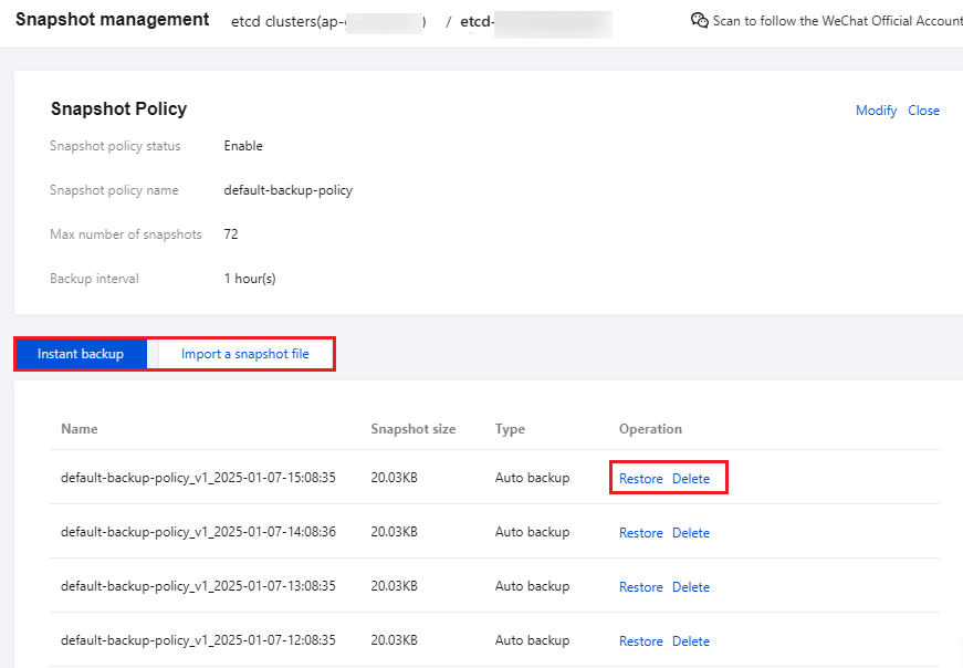 The etcd cluster snapshots support snapshot file import, restoration, and deletion operations, as shown in the figure below: