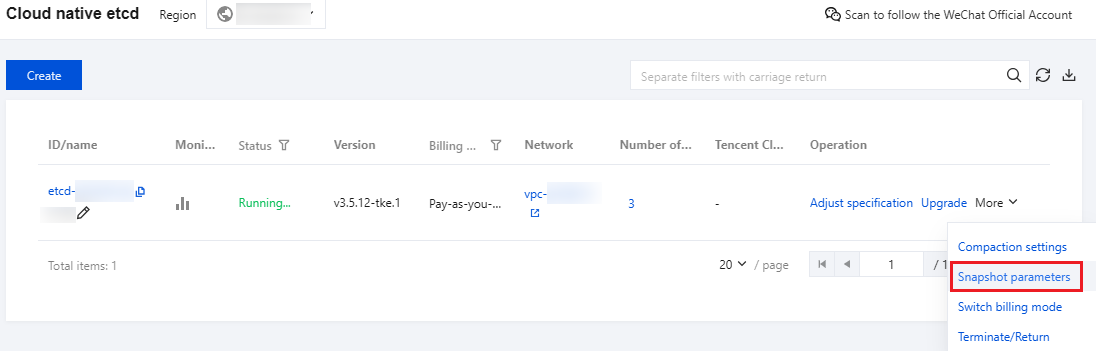 2. Select the region on the Cloud native etcd page, and choose the target etcd cluster from the cluster list below.